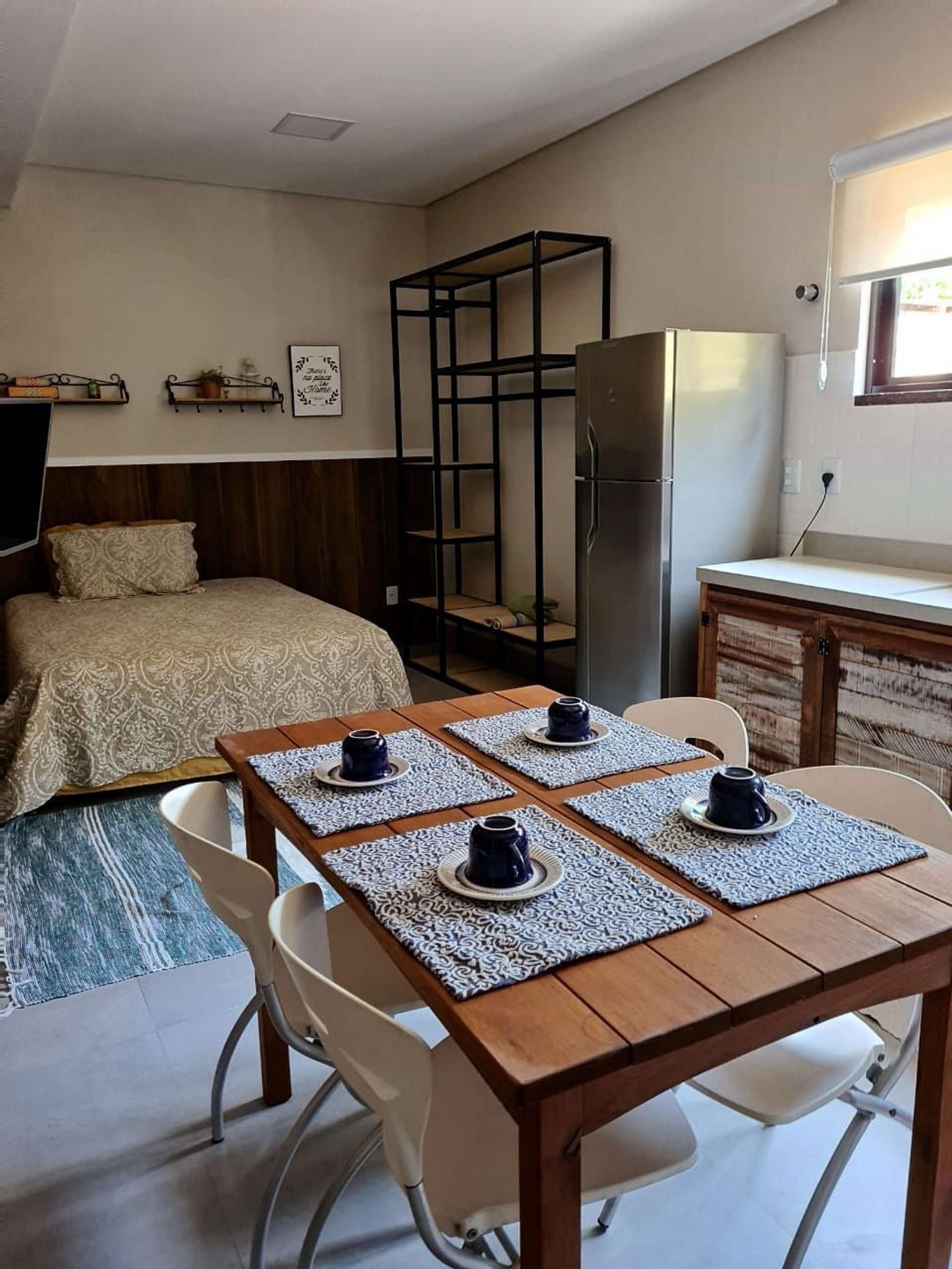 Apto tipo Studio, conceito aberto (não tem divisórias), contem um banheiro privativo e uma cozinha completa com itens básicos para 4 pessoas realizarem todas as refeições. Apartamento de frente para a rua, com um lance de escada conforme as fotos, as categorias desse andar são internamente todos iguais em tamanho e janelão, porém pode alterar alguma decoração ou cor dos moveis.
