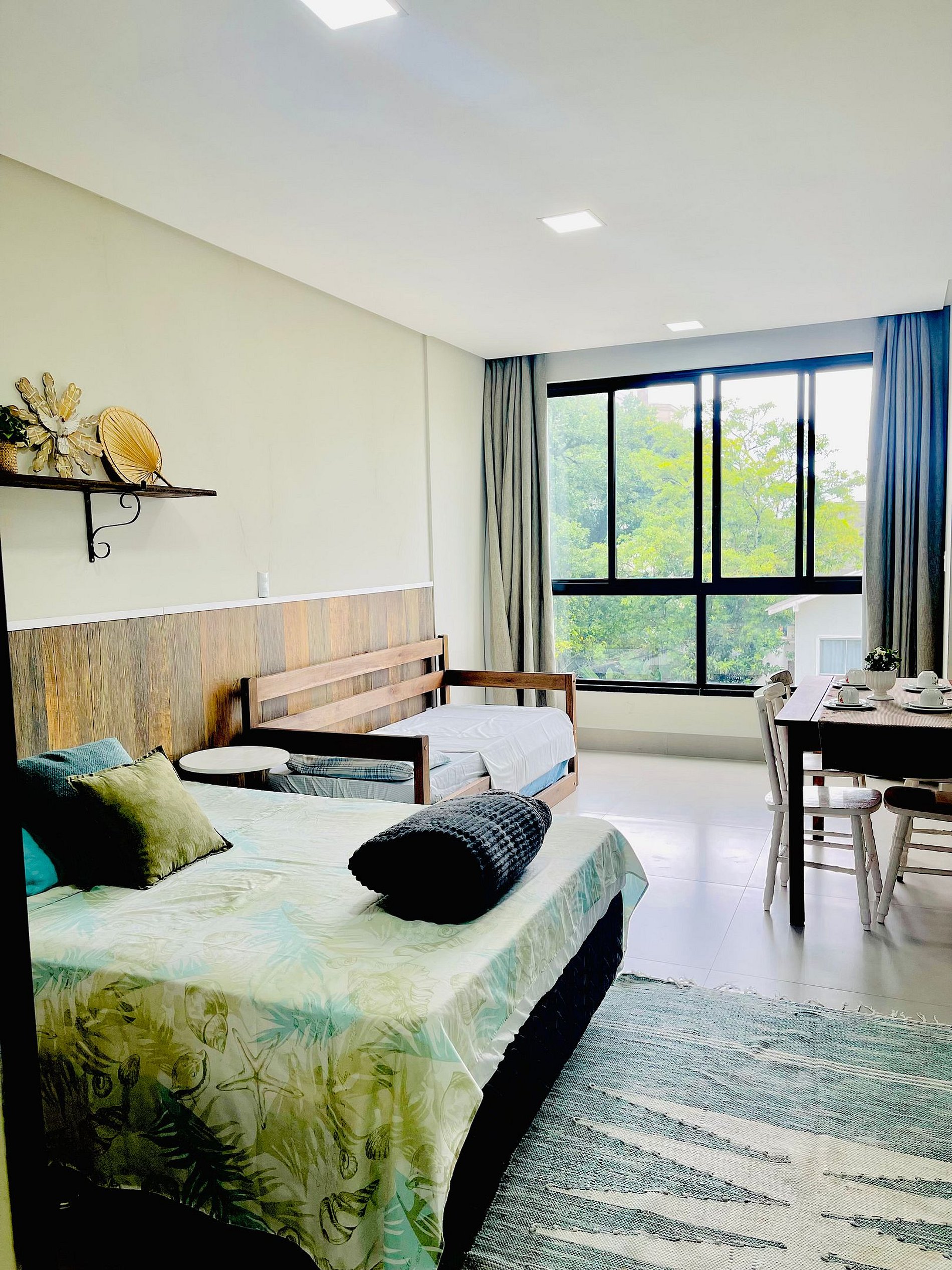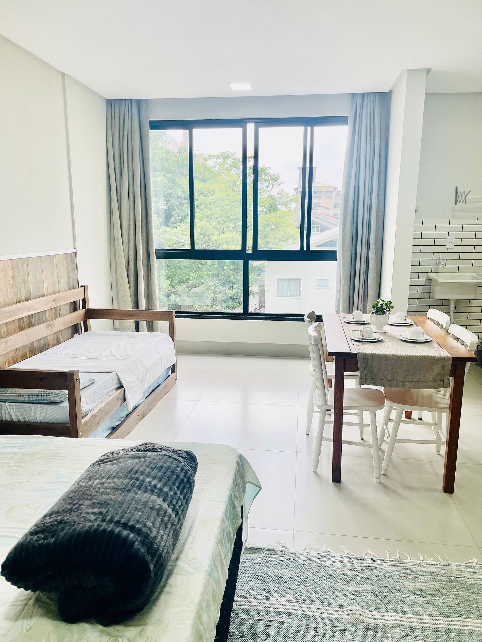 RESIDENCIAL VILA DAS CANOAS Acomoda bem 4 pessoas, apto tipo Studio, conceito aberto (não tem divisórias), contem um banheiro privativo e uma cozinha completa com itens básicos para 4 pessoas realizarem todas as refeições . Apartamento na lateral do prédio, com um lance de escada conforme as fotos, as categorias desse andar são internamente todos iguais em tamanho e janelão, porem pode alterar alguma decoração ou cor dos moveis.